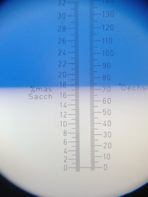 You should see the Degrees Brix shown in the viewer. From the above photo, you can see that the Degrees Brix is about 17.8 (shown as °mas Sacc since I purchased this refractometer in Switzerland all the markings are in German).
