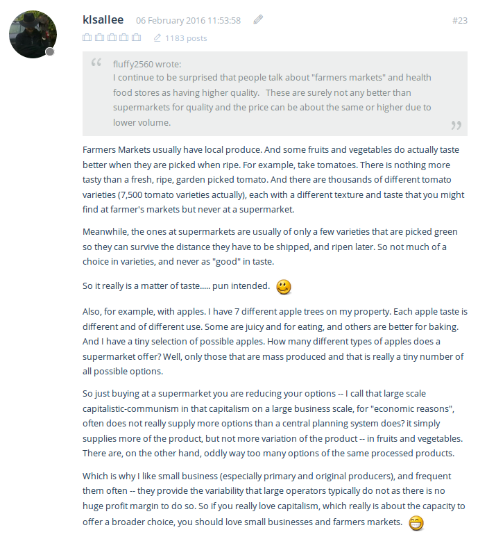 Farmers Markets -vs- Supermarkets 10 Wednesday Feb 2016 Posted by stcoemgen in Farming, Food and Cooking, Gardening ≈ Leave a comment Tagsfarming, food, gardening Interesting discussion about food shopping at the expat.com forum. My view on one side topic in the forum, regarding farmers markets versus supermarkets: Farmers Market vs Supermarket. Share this: Click to email a link to a friend (Opens in new window) Email Click to share on Pinterest (Opens in new window) Pinterest Click to share on Pocket (Opens in new window) Pocket Click to share on Telegram (Opens in new window) Telegram Like Loading... Related