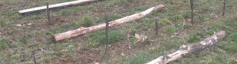 The vines planted on property 2 (and replanted since we had quite a bit of die off the first two years) are now old enough, and growing tall enough, to require wire trellis supports. I am installing 2.5 m (8 ft) black locust posts as the trellis supports. Stout posts are going in every 20 m (66 ft) with smaller supporting posts every 10 m (33 ft). To avoid soil compaction by machinery of the moist spring soil, the post holes are being dug with a hand soil auger to a depth of 80 cm (32 in), which leaves 1.7 m (6 ft) of the post above ground to support the trellis wire.