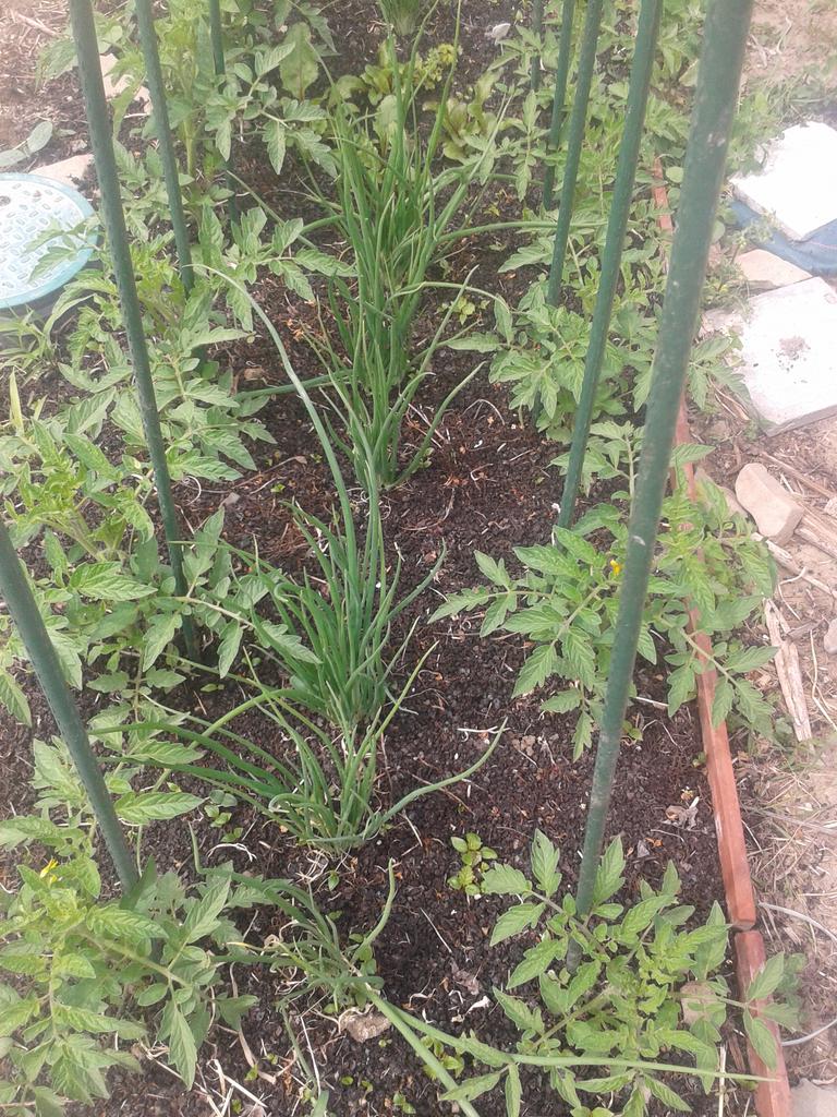 I planted my tomato starters late last month, replacing the radish that where there for the first crop of the year. The onions in the photo below were started as multi-sown starters in February (I also start my tomatoes in February). Onions are a good companion plant for tomatoes and were planted with long term planning knowing tomatoes would be planted after the radish. You may also notice this is a no dig bed.