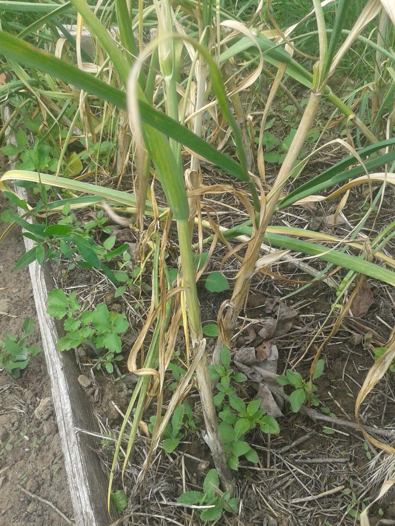 My garlic were looking a bit… dry…. early this month of June. And I was fooled into thinking because we had one of the driest Mays on record, they just needed water. But when I dug one up, I saw, no, they were actually over ripe and past their harvest date. Three weeks earlier than normal….