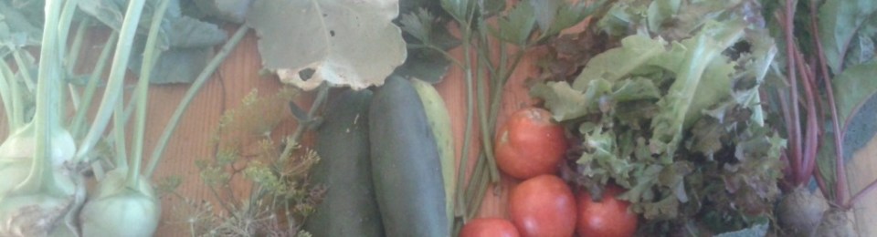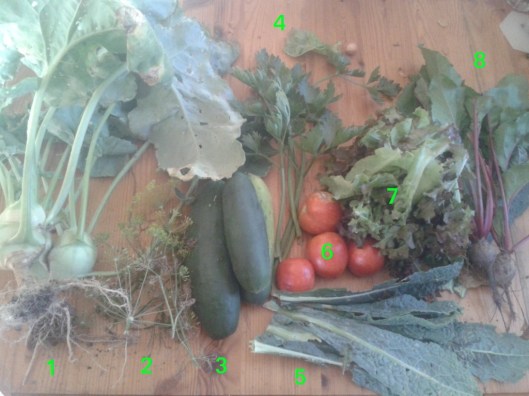 Garden harvest. (1) Green Kohlrabi, (2) dill, (3) cucumbers. (4) celery, (5) kale, (6) tomatoes, (7) lettuce, (8) beets.