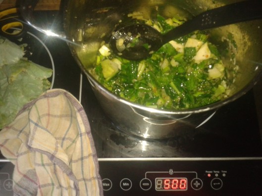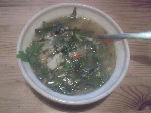 The rest, I put into a pot, caramelizing the onions and garlic, sautéing the other greens and tomatoes, then cooking in water a little longer to make a soup. With a dash of salt for flavor. The result.