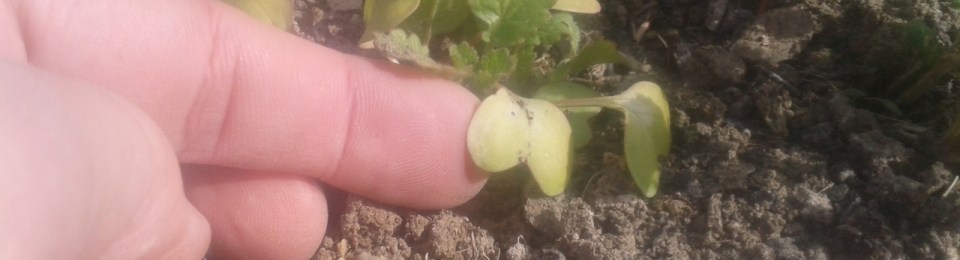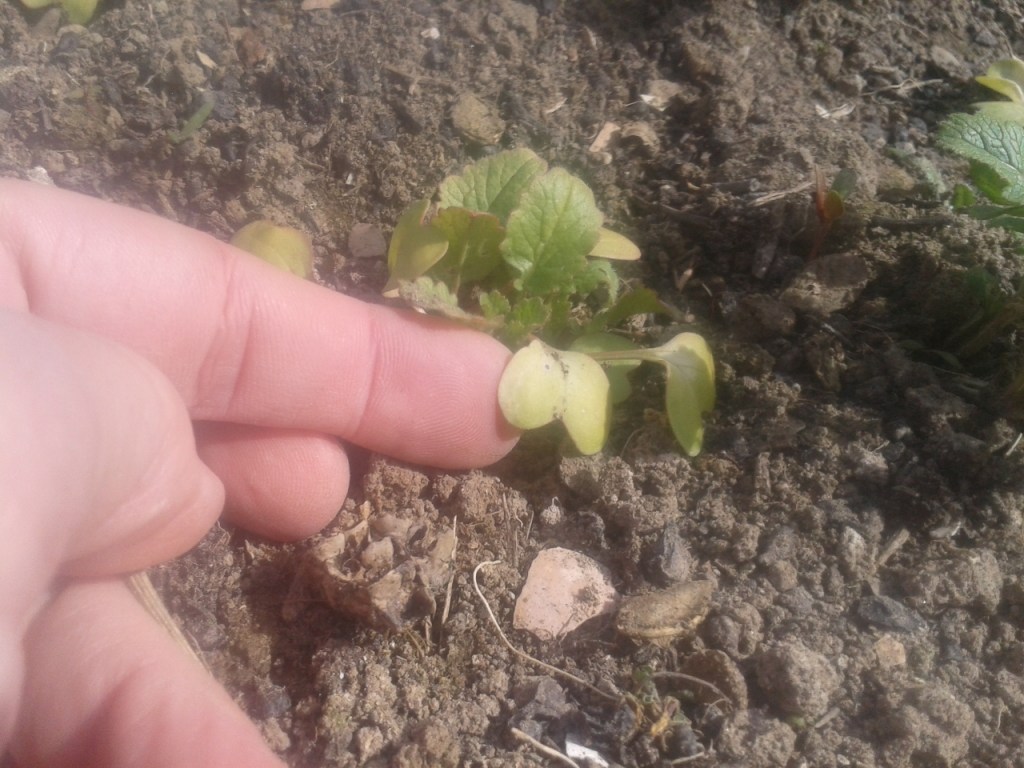 First my radish. I covered them with 34 grams of fleece. They did well. No loss. But some of the more tender cotyledon leaves did show frost burn with white blotches (The larger plants in the photos are over wintered turnips; I planted my radish between them as a follow-up crop).