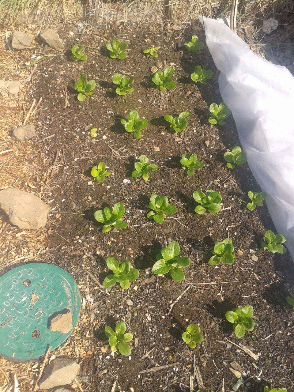 The lettuce were covered by 34 g of fleece, seen to the side, for the past 3 weeks. Grown on a no-dig compost bed.