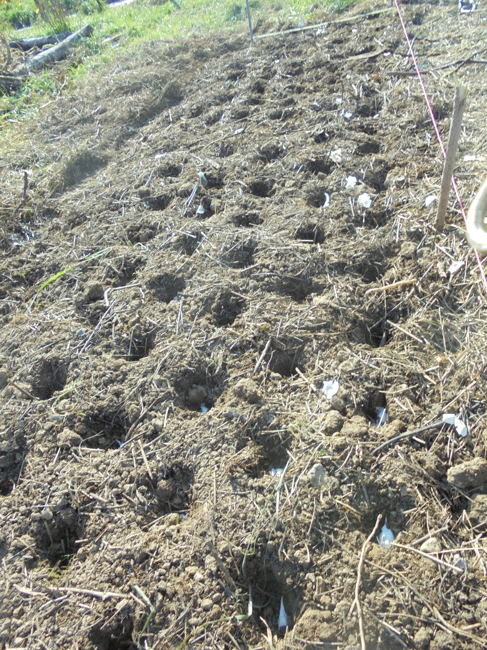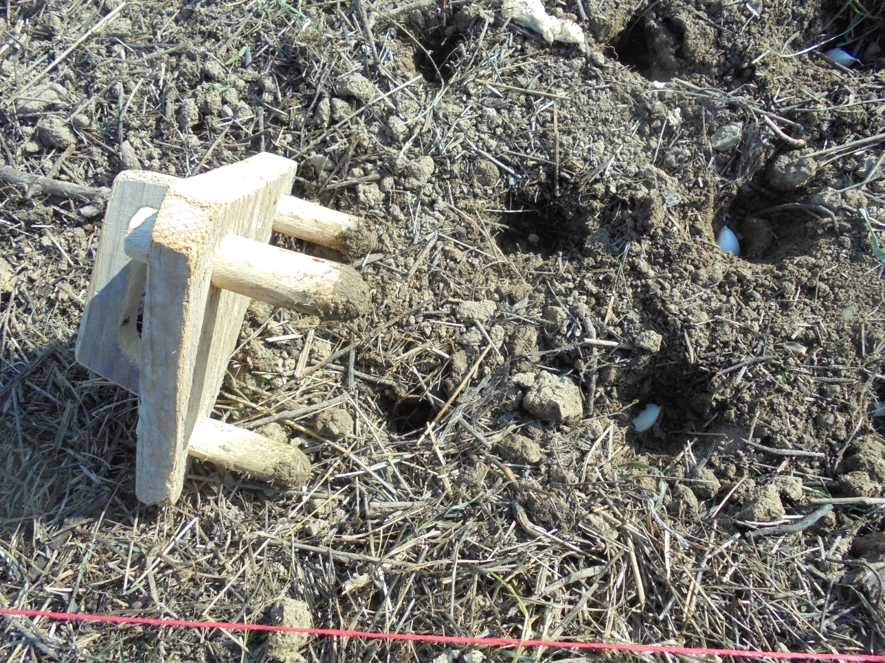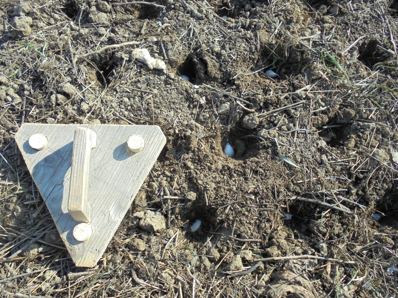 I decided to go with an equilateral spacing of my garlic, so I made a three pronged dibber. The plants end up in a hexagonal pattern. Which is the most efficient use of space. It worked very well, and planting 400 garlic only took a few hours.